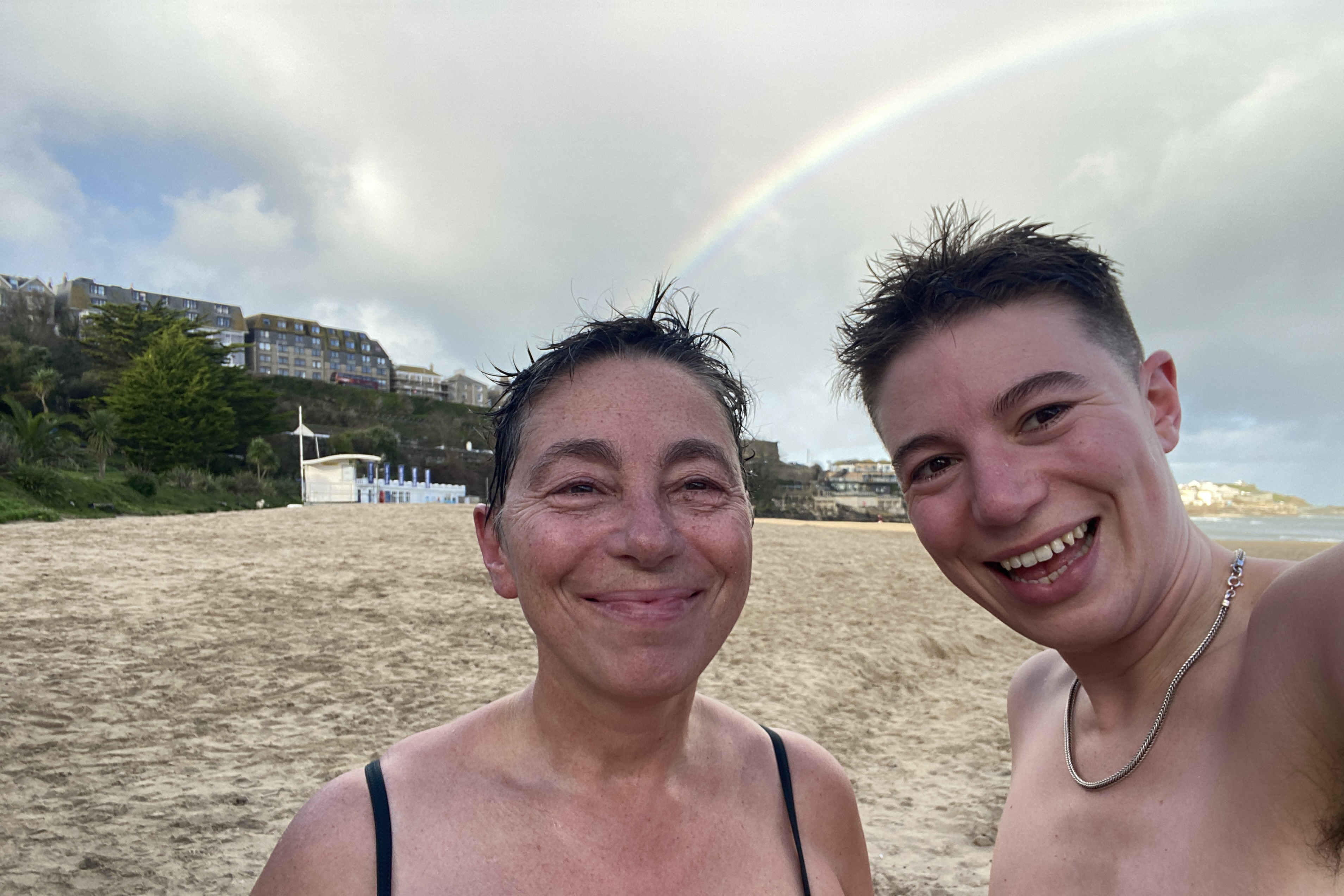 This December, we braved the grey skies and light rain and headed to the sauna for a morning session. It's about half way along Porthminster beach right next to the path that leads towards Carbis Bay. There are changing rooms next door and there is an attendant keeping watch, so you can leave your things there while you sauna. Once we entered the woody thick heat of the sauna we immediately forget all those fleece layers and raincoats. Our muscles relaxed, and we took deep breaths of hot dry air. We sat there chatting, baking ourselves and admiring the view: There are windows looking out over the water to St Ives Harbour in one direction and Virginia Woolf's lighthouse in the other. We were even graced with a rainbow that arced over the town and straight down into the water.